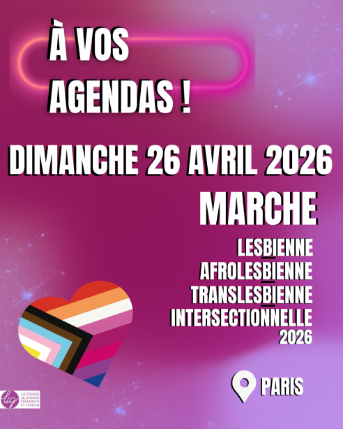 Rejoignez-nous dans nortre cortège à la marche lesbienne, afrolesbienne, translesbienne intersectionnelle : rendez-vous ce dimanche 26 avril à partir de 13h30 à gare de l’Est, place Madeleine Braun.