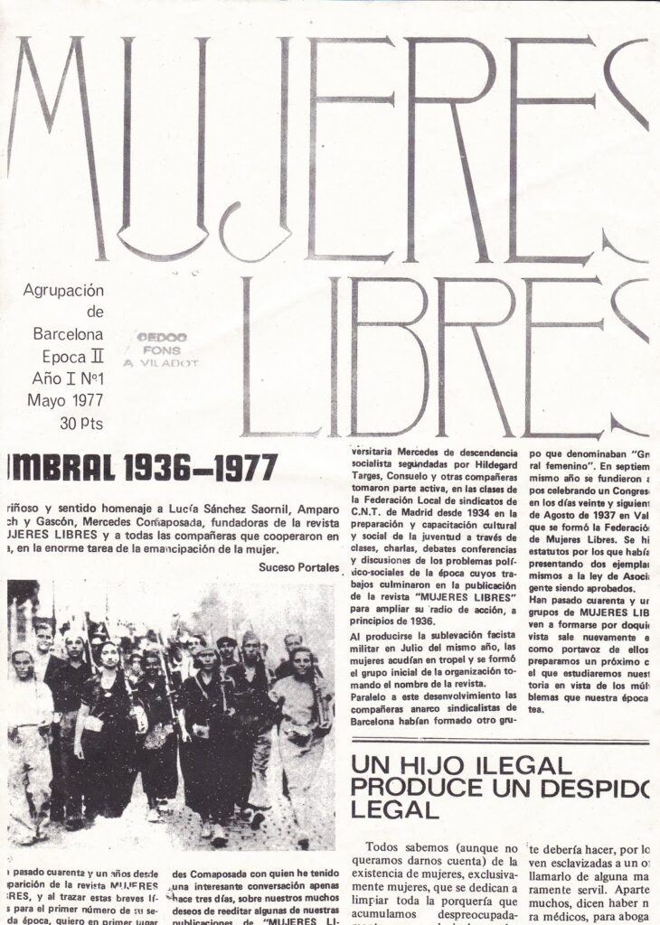 Également, ce qui est intéressant de voir, c’est qu’est-ce qui se passe une fois que la dictature est terminée. Ces femmes, elles arrivent pour la plupart en 1939, elles restent toute leur vie en France. La grande majorité de leur vie, elles l’ont passé en France. Et la dictature se finit en 1975, et du coup il y a la redécouverte d’un pays quitté, mais qui en réalité n’est plus le pays qu’on a quitté parce qu’il a évolué, il a changé, il a été détruit. Certaines vont faire le choix de rentrer en Espagne, d’autres font le choix de rester en France, là où elles ont construit leur vie, finalement. Mais cette ouverture de la frontière, elle permet de reprendre contact avec les nouvelles générations. C’est-à-dire les jeunes femmes qui sont nées pendant la dictature, après la guerre, qui n’ont rien connu de tout ça. Et pourtant, malgré tout l’effacement de la mémoire qu’il y a eu, malgré toute la dictature, il y a des espèces de résistances mémorielles qui se créent. Un nouveau Mujeres libres se crée, notamment à Madrid, Barcelone, Bilbao et, je crois, une autre ville. Cette fois-ci par des femmes jeunes, qui n’ont pas connu la guerre, qui n’ont connu que la dictature, et qui décident de récupérer cette histoire. Elles vont également faire une revue. Et d’ailleurs il y a des groupes qui sont toujours actifs ! Donc depuis les années 1990 voire 1980, il y a des groupes Mujeres libres qui sont encore actifs aujourd’hui et qui continuent cet héritage. C’est intéressant de voir comment des femmes, en 1936, lancent une revue de femmes anarchistes qui s’appelle Mujeres libres, comment des femmes en exil tentent de résister à l’exil, avec encore une fois, une revue qui s’appelle Mujeres libres, et comment, des années après, des jeunes, des nouvelles générations, reprennent le flambeau pour continuer ce travail, et continuer à faire exister des idées qui sont très nouvelles.