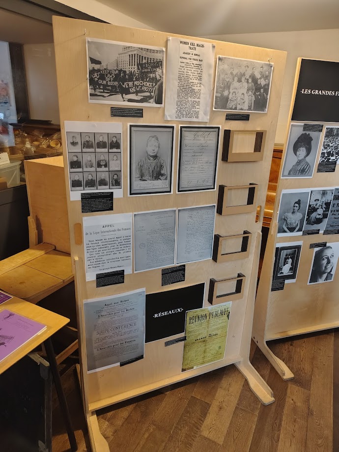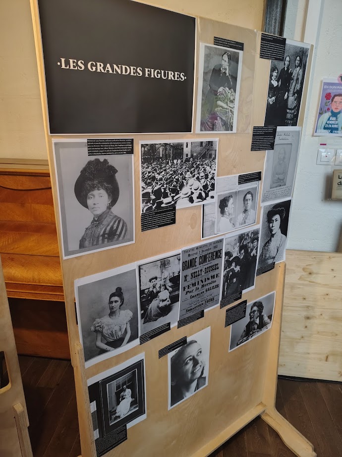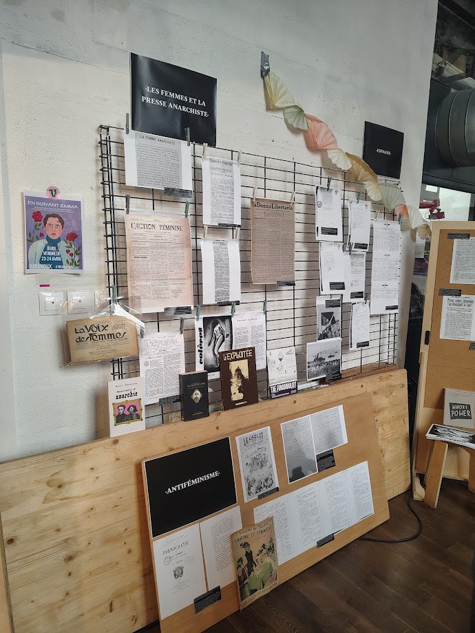 Juliet (Féministes révolutionnaires) : Merci beaucoup, tu as tout dit. C’est notre première exposition, donc soyez indulgent·es ! On voulait mettre à l’honneur non seulement les grandes figures et les collectifs des mouvements anarchistes et féministes, mais aussi mettre en valeur et rendre un peu hommage à toutes les petites mains des mouvements militants, des archives, les militant·es chercheuses qui passent leur temps à écumer des bases de données, à numériser des vieux papiers, à faire tout ce travail qui est vraiment incommensurable et qui n’a jamais de fin. C’était aussi pour rendre justice au collectif Archives autonomie, aux bibliothécaires de la bibliothèque Marguerite Durand à Paris, à toutes les archives de presse anarchiste numérisées en ligne… C’est beaucoup de taf du coup ça nous tenait à cœur de vous présenter ça. Je pense aussi à une camarade des Féministes révolutionnaires qui a partagé aussi les archives émouvantes de son grand-père réprimé par la dictature franquiste. On vous invite à prendre un petit peu de temps après la table ronde pour consulter tout ça. Et dernières réjouissances de la soirée : il y a une tombola à partir des livres de grandes théoriciennes et penseuses de l’anarcha-féminisme. N’hésitez pas aussi à prendre un petit billet et à repartir avec Lucie Parsons, He Zhen et Emma Goldman dans votre poche !