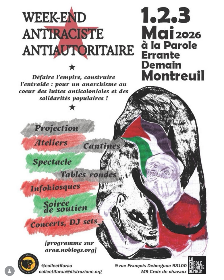 Personne du public : C’est juste pour revenir un peu en arrière sur l’anarchisme et l’antiracisme. Et pour préciser un peu ce que tu as dit sur le weekend de l’ARAA à la Parole Errante. L’ARAA, c’est un collectif qui s’est créé face à la blanchité des milieux anarchistes. Pendant ce weekend, on veut parler de plein de sujets, mais notamment beaucoup d’anarchisme, et d’antisionisme, et de santé et de soin, et d’adoption internationale. Il y aura une soirée de soutien le samedi soir à des collectifs en lutte pour la Palestine, le Soudan, et aussi plus locaux en France. Tout le monde est bienvenu. Ça va être super. Il y aura aussi une pièce de théâtre le vendredi soir, et une AG antiraciste et anti-autoritaire le dimanche après-midi.